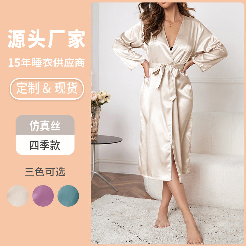 Long Maxi Hem Tie Taist Silk Robe avec V-Neck