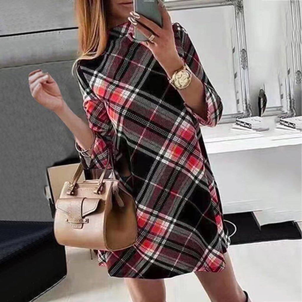 Gaun mini kotak -kotak dengan lengan panjang 3/4