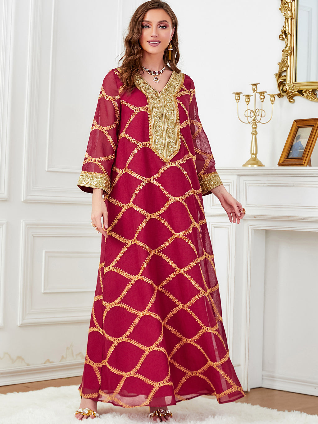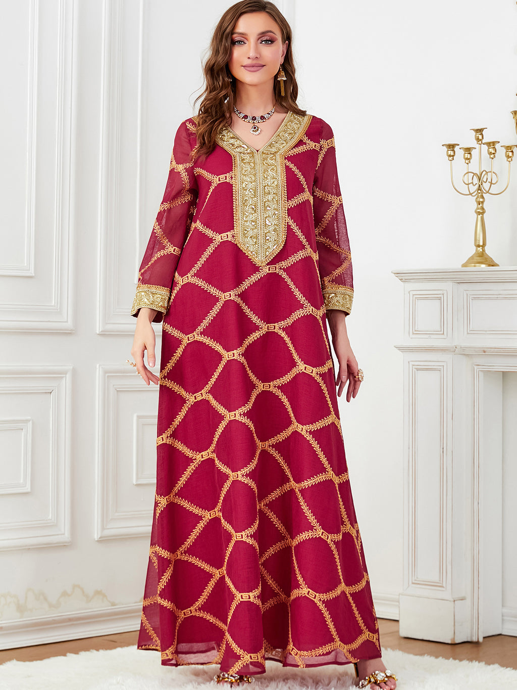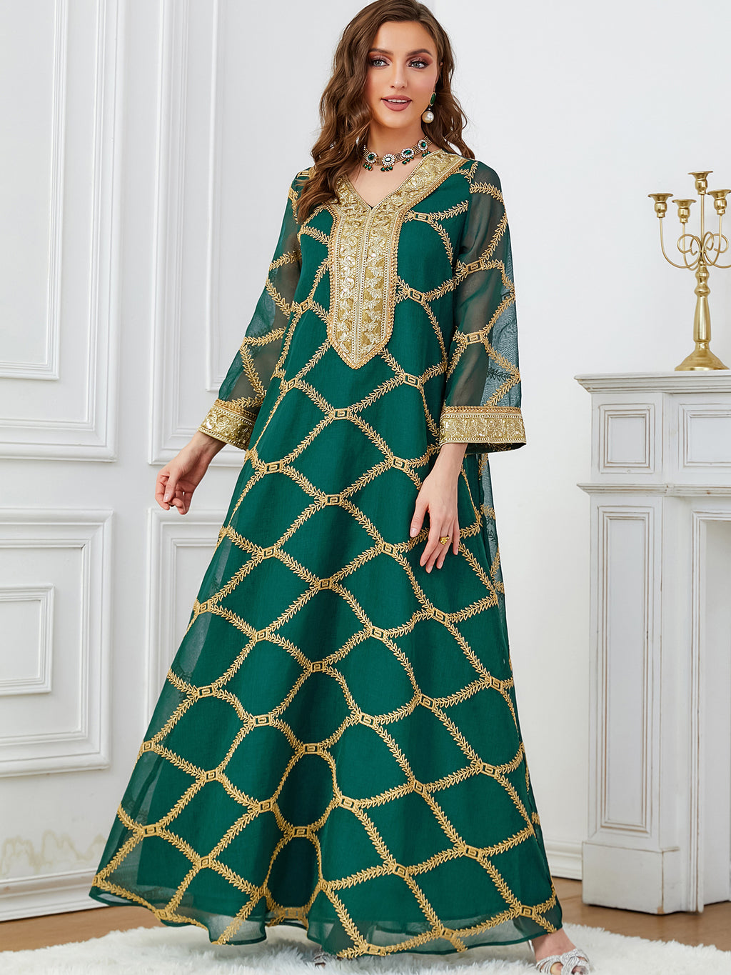 Women's Emerald Green and Gold Long Sleeve Maxi Dress