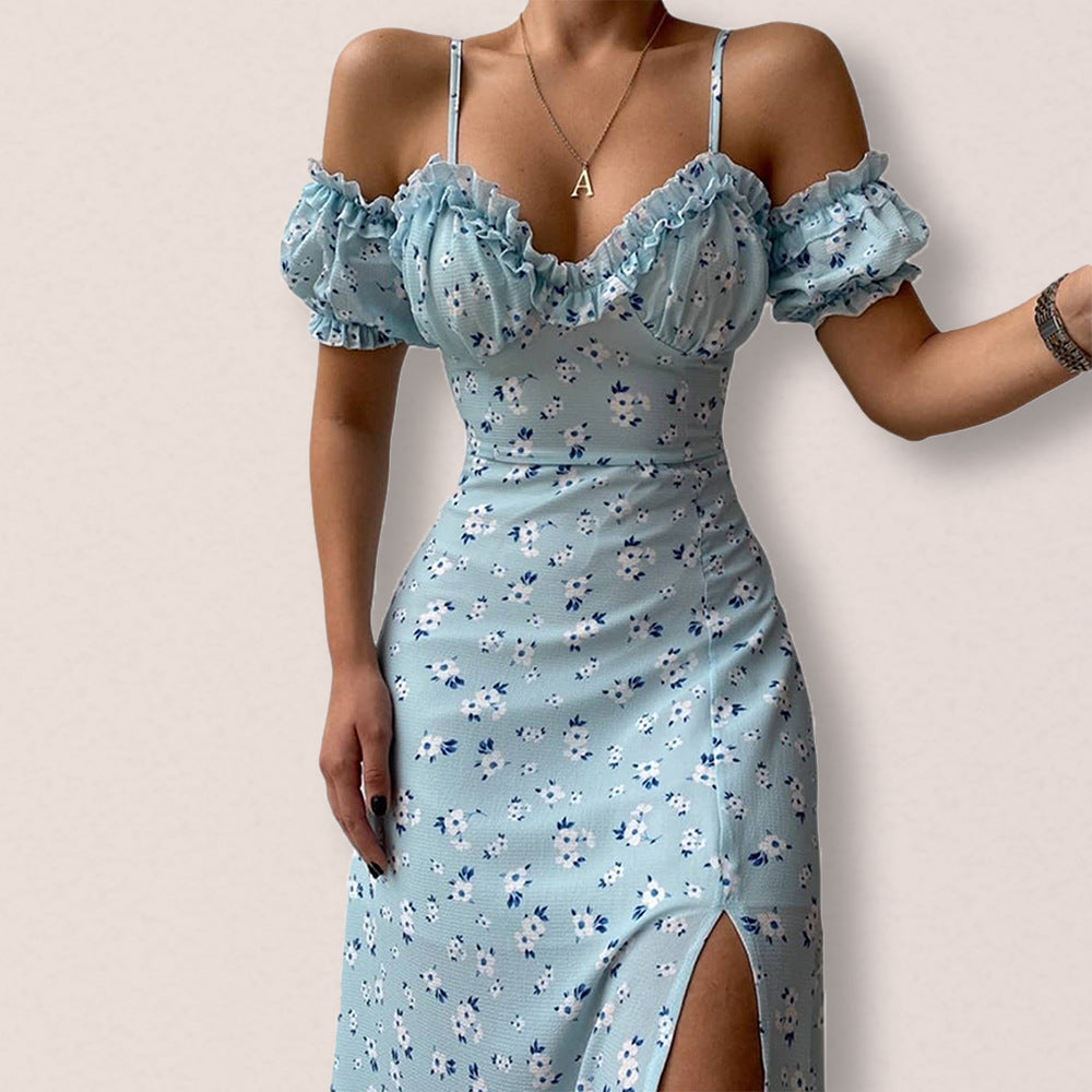 春のピクニックと夏の午後の日付に最適な肩からのミディの長さの恋人の首は、あなたが間違っていない選択です。 6色とパターンのいずれかから選択します。