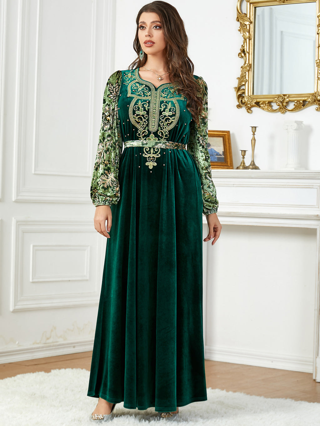 Draai de hoofden door de maxi -jurk van de bisschopmouw van de dames te dragen met gouden details. Gouden glanzende mouwen passen bij de taille stropdas en het lijfje.