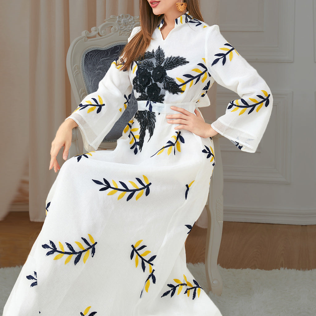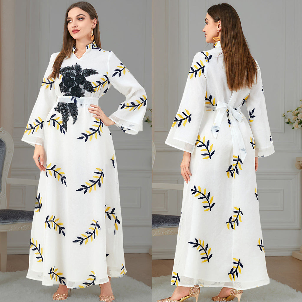 Steek je lente ensembles op met de Mock Neck Botanical Print Maxi -jurk met de dames met een unieke blauwe kanten patch op het lijfje.