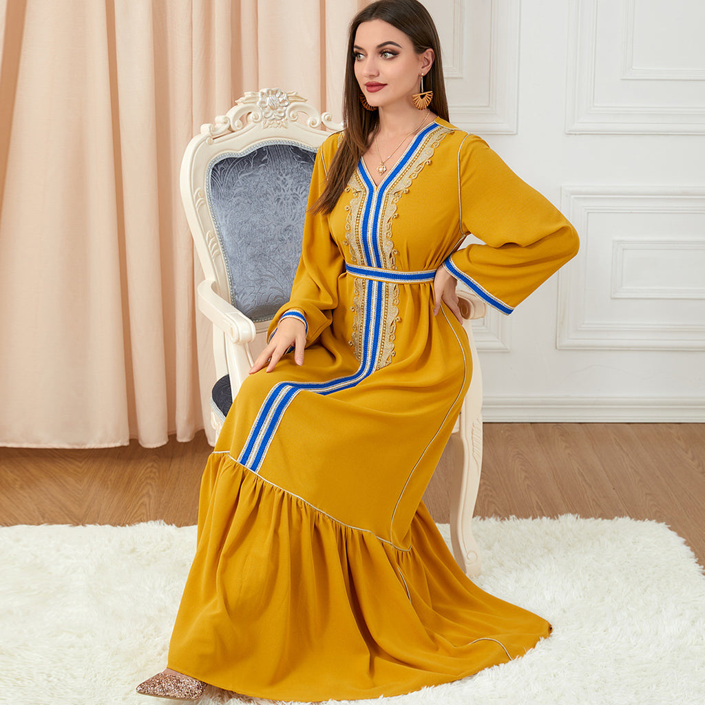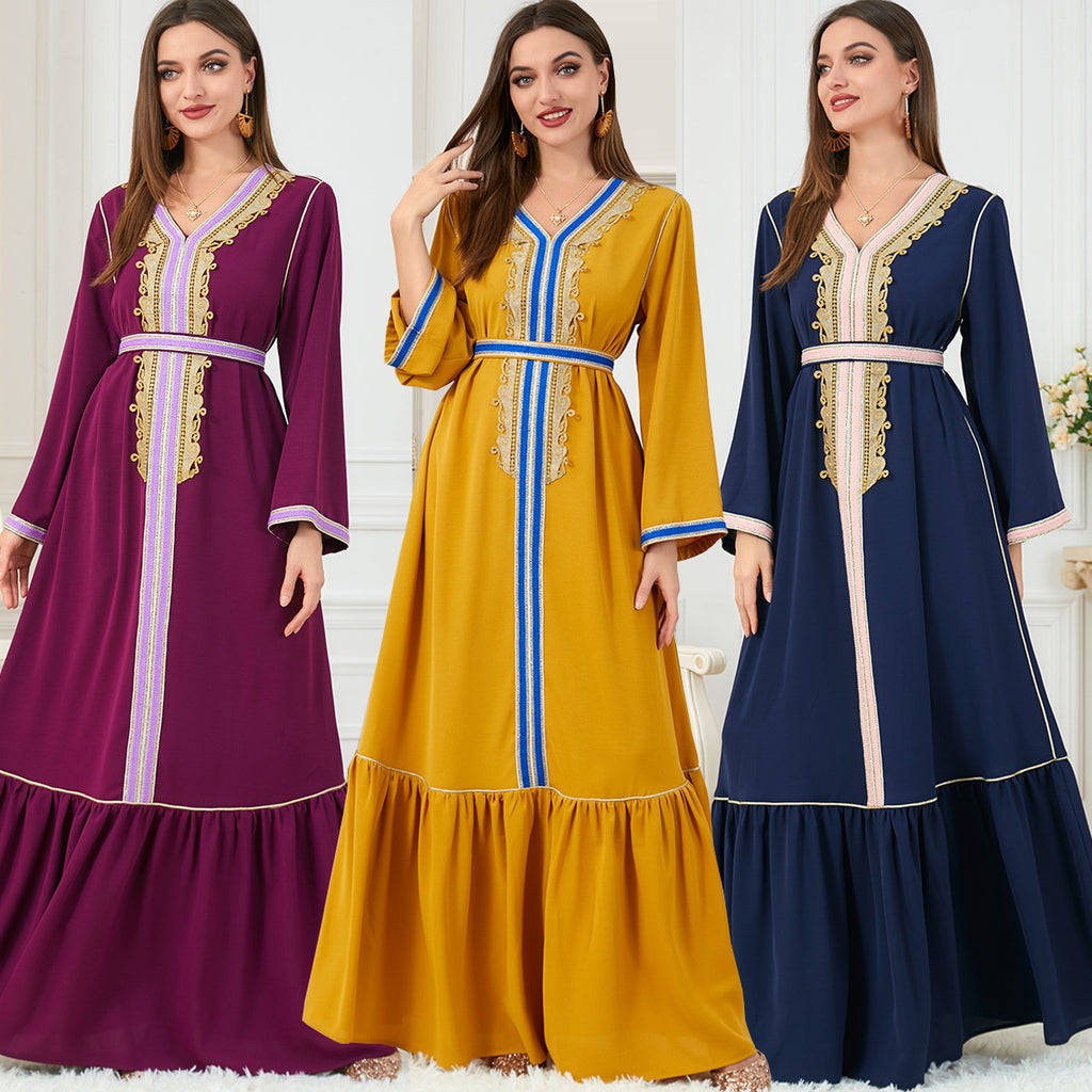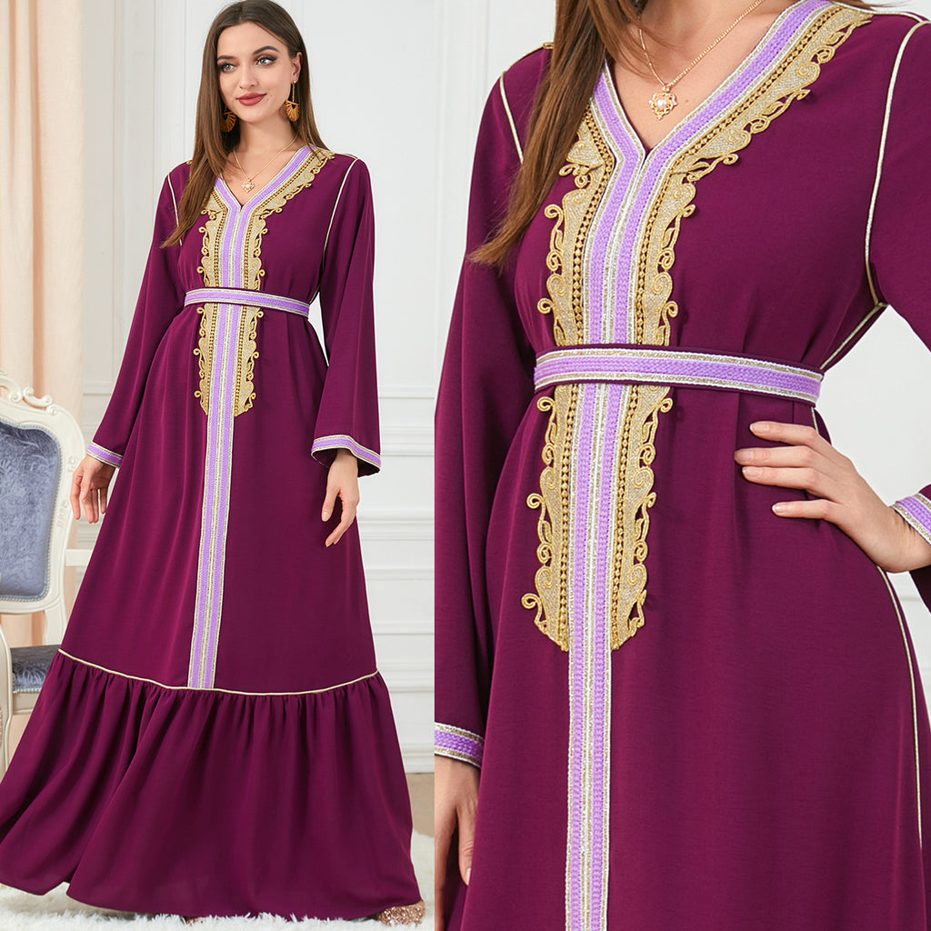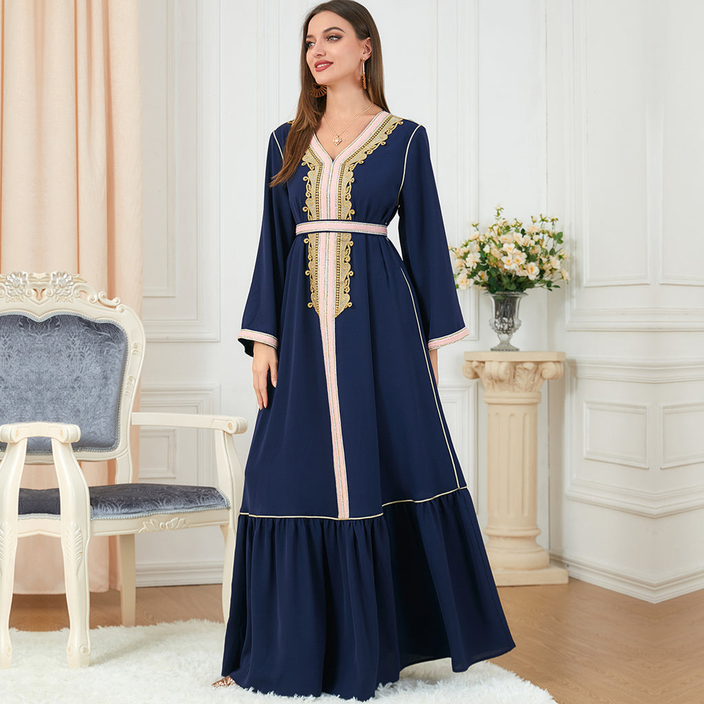 Voeg een koninklijke touch toe aan je nachtelijke ensembles met de fluweelachtige blauwe maxi -jurk met lange mouwen met roze, gouden en witte details aan de voorkant.