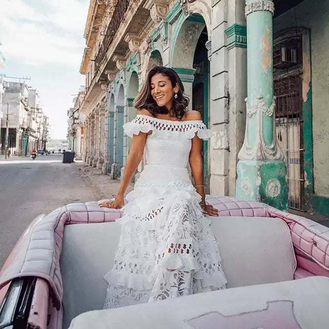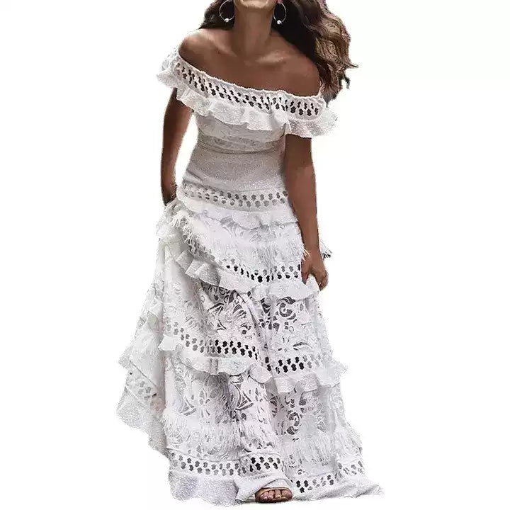 Women's Crocheted Tiered Maxi Dress with Off the Shoulder Neckline