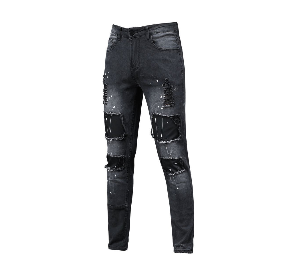 Afaste -se na rua usando o jeans urbano escuro desses homens com lágrimas. Atrás do jeans está o tecido preto que faz o hospedeiro para pintar respingos em uma cor branca contrastante.