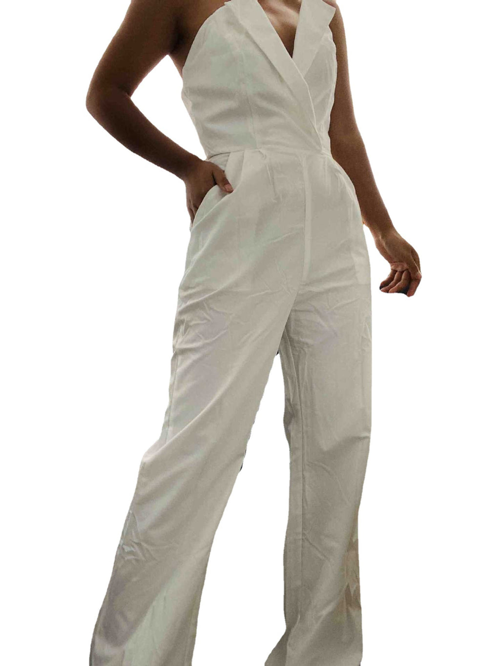 穿著寬闊的腿的女子袖子V領褲子,讓她看起來很簡單。這款緊身衣的領口具有獨特的僵硬的領口,並從中切出V形狀,以實現現代和時尚的外觀。