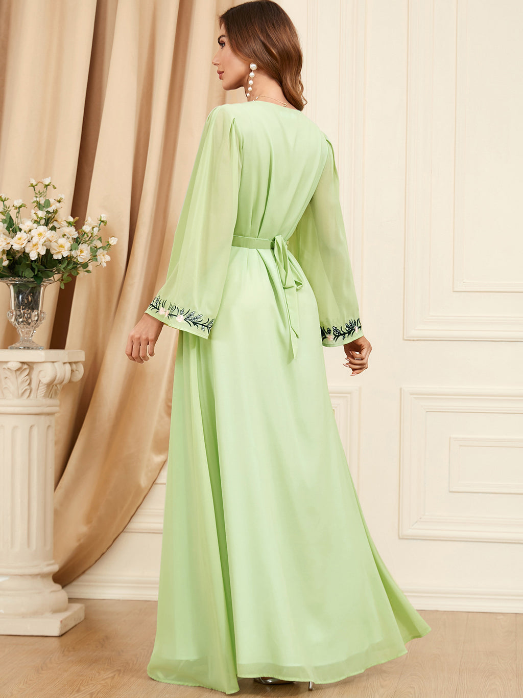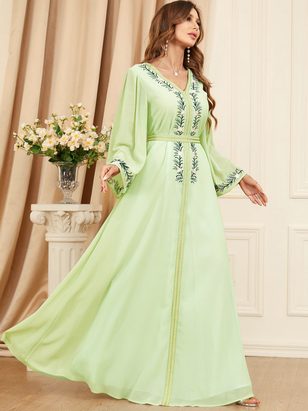 Bring fresh color to your wardrobe with the springtime-inspired Women's Long Sleeve Maxi Dress with Shimmery Golden Details. It comes in blue, mint or pale yellow.